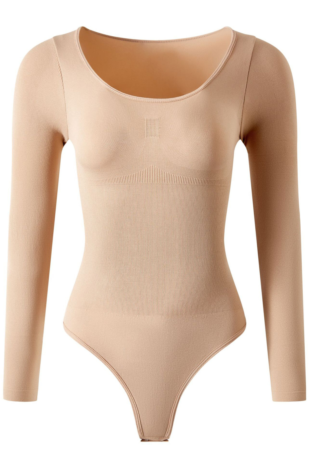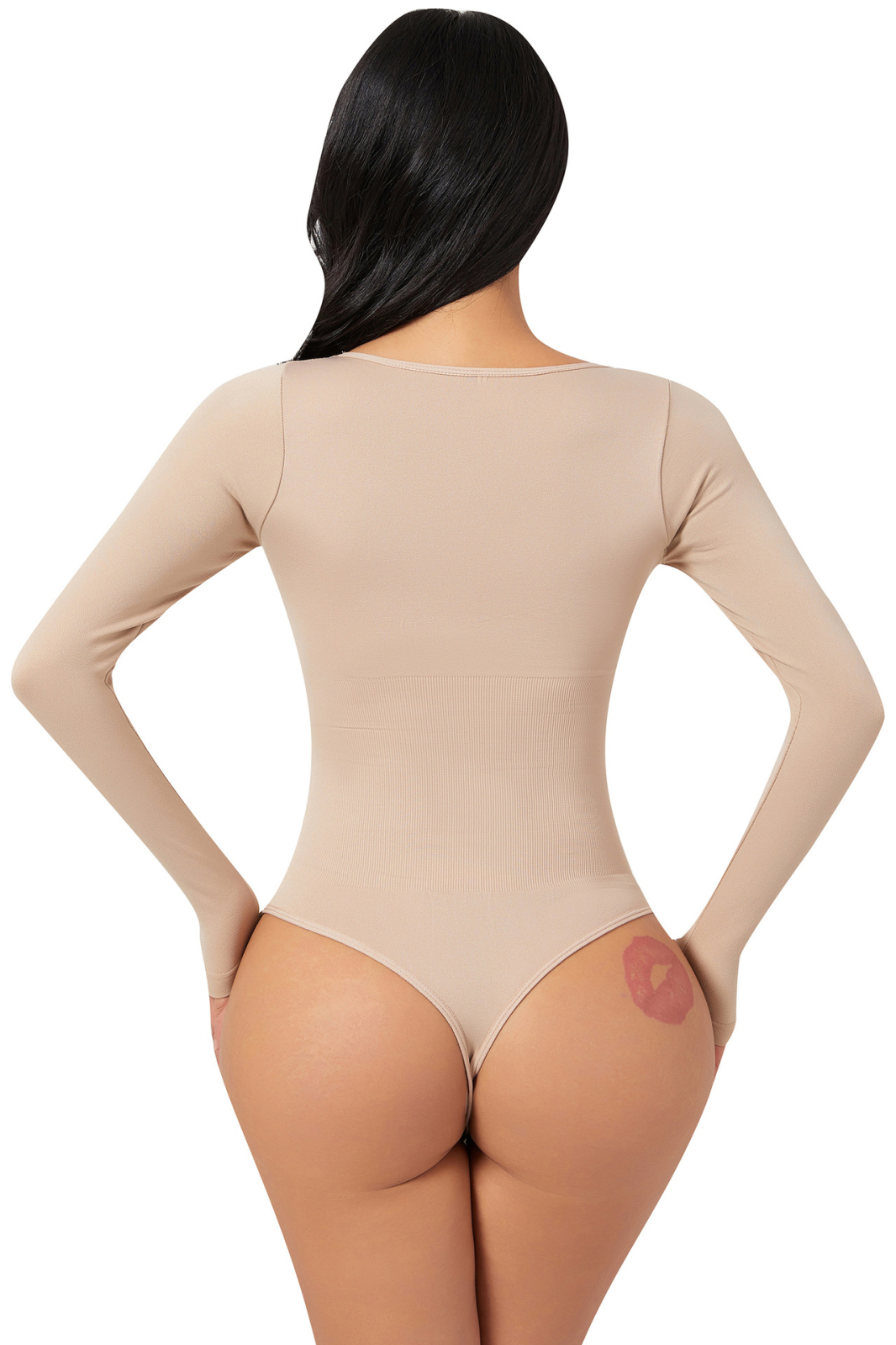 Body Modelator cu Efect de Compresie, cu Maneca Lunga si Chilot Tanga Bej