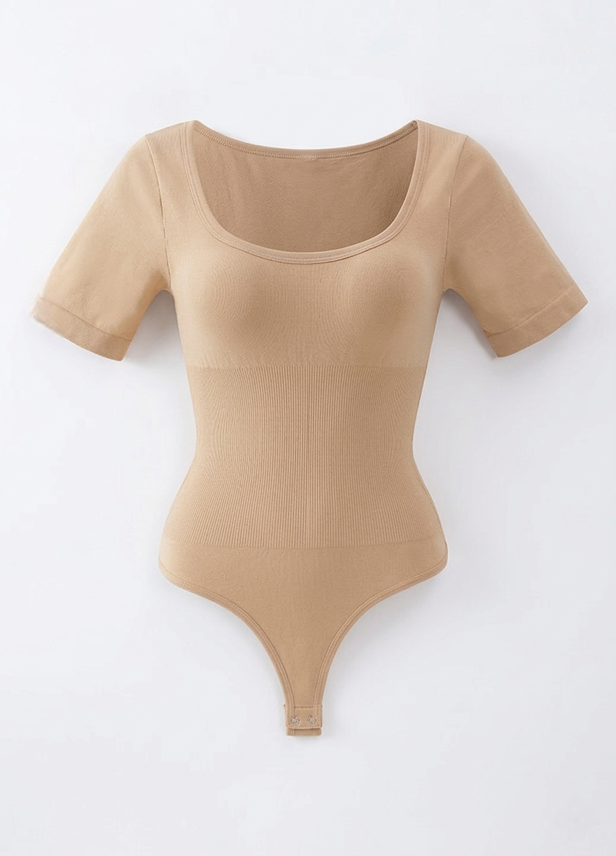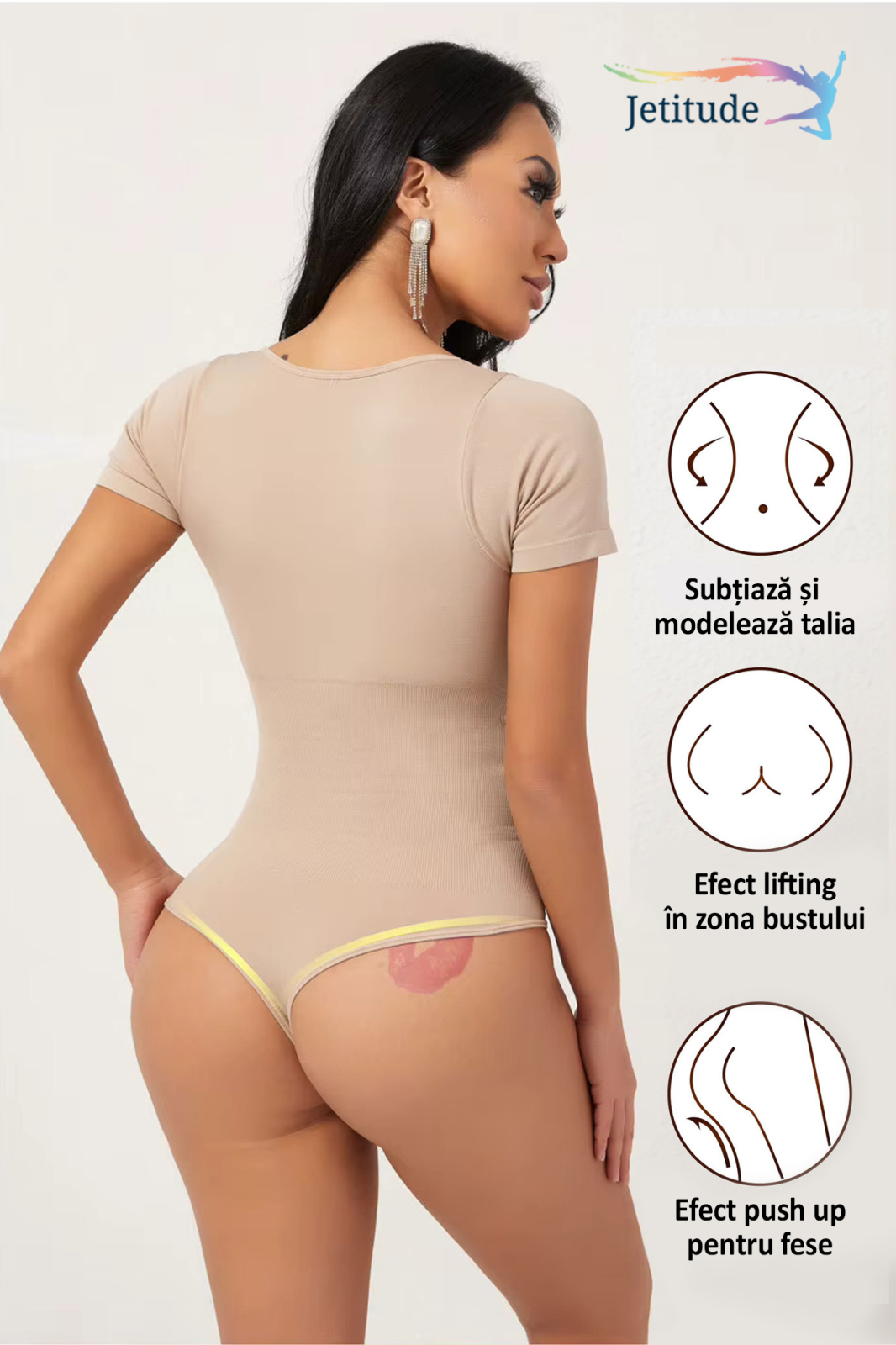 Acest body modelator nu numai că evidențiază silueta și subțiază talia, ci oferă și un efect de aplatizare și restângere a abdomenului, creând o senzație de încredere și eleganță. Cu un design tip bluză cu mânecă scurtă și cu chilot tanga dintr-o singură bucată, este elegant și stilat, se mulează perfect pe corp și oferă un aspect de talie subțire. Are un croi special pentru zona bustului, care susține și ridică ușor sânii.