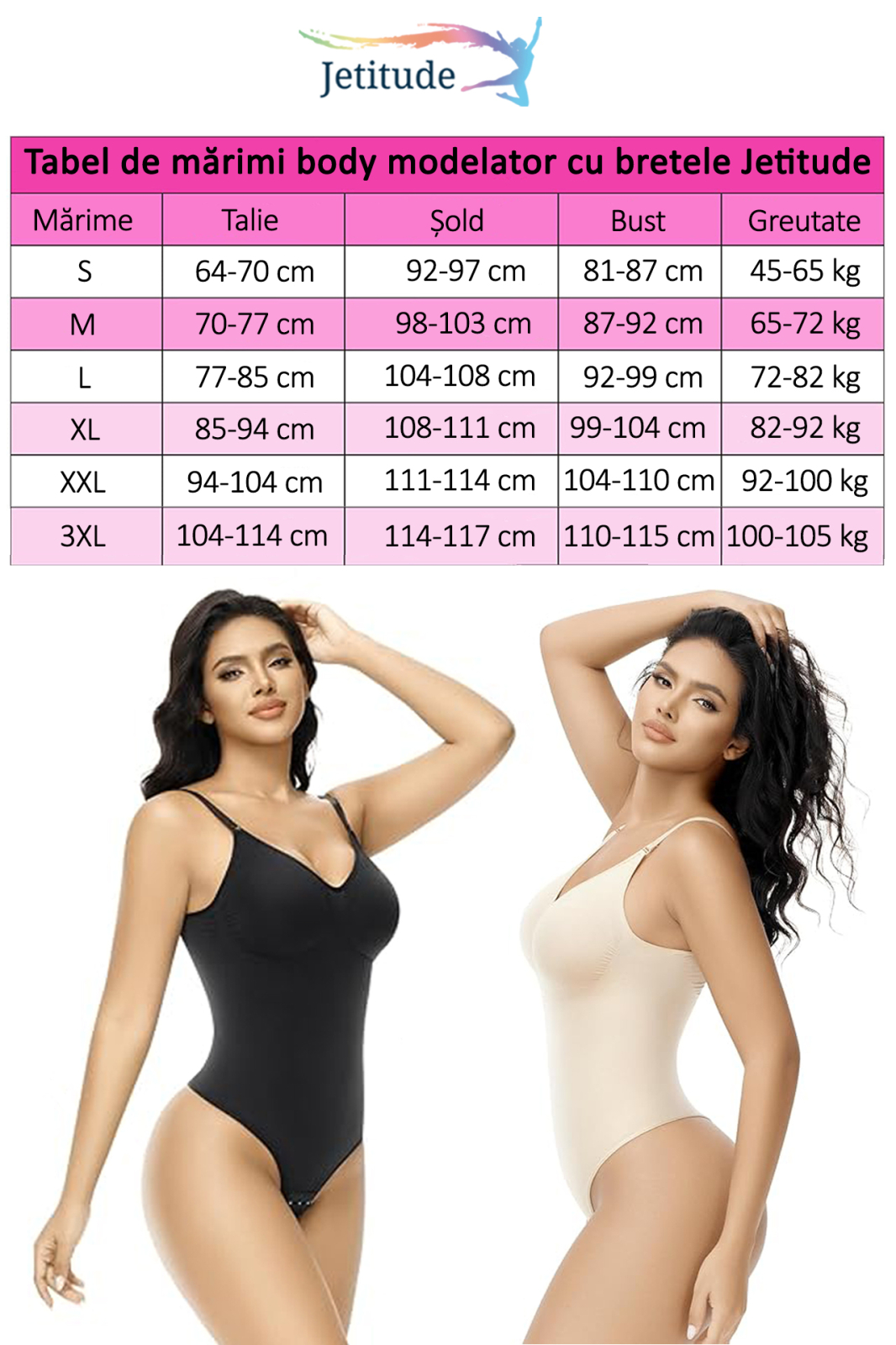 Acest body modelator nu numai că evidențiază silueta și subțiază talia, ci oferă și un efect de aplatizare si restangere a abdomenului, creând o senzație de încredere și eleganță. Cu un design tip maiou cu chilot clasic dintr-o singură bucată, este elegant și stilat, mulează perfect pe corp și oferă un aspect de talie subțire. Are un croi special pentru zona bustului, care sustine si ridica usor sanii.
